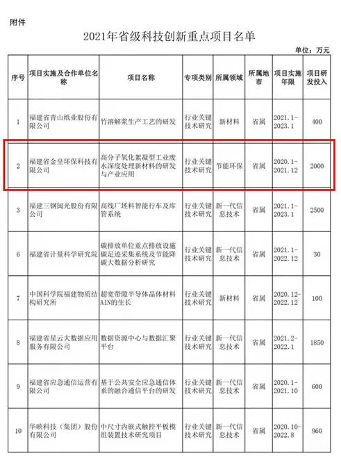 近日,福建省工業(yè)和信息化廳以《閩工信函科技〔2021〕476號(hào)》文發(fā)布了《關(guān)于印發(fā)2021年省級(jí)科技創(chuàng)新重點(diǎn)項(xiàng)目的通知》,金皇環(huán)保自主研發(fā)項(xiàng)目“高分子氧化絮凝型工業(yè)廢水深度處理新材料的研發(fā)與產(chǎn)業(yè)應(yīng)用”成功入選。