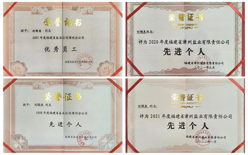 劉錦泉在工作崗位獲得的榮譽(yù)證書