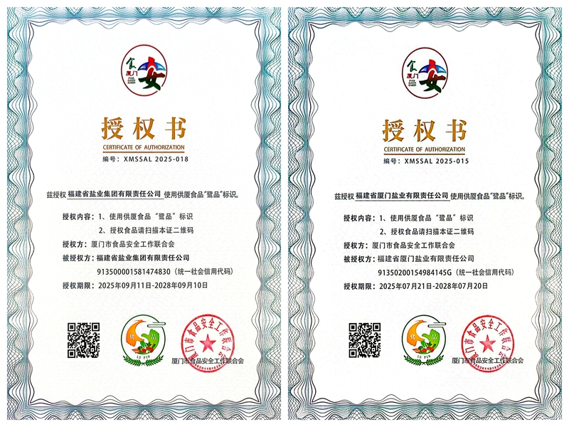 近日,廈門市食品安全宣傳周主題日活動(dòng)隆重舉行,現(xiàn)場同步舉行廈門市“鷺品”標(biāo)識認(rèn)證授牌儀式,福鹽集團(tuán)及其權(quán)屬企業(yè)廈門鹽業(yè)獲得供廈食品“鷺品”標(biāo)識正式授牌。